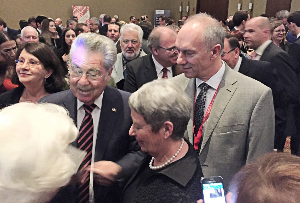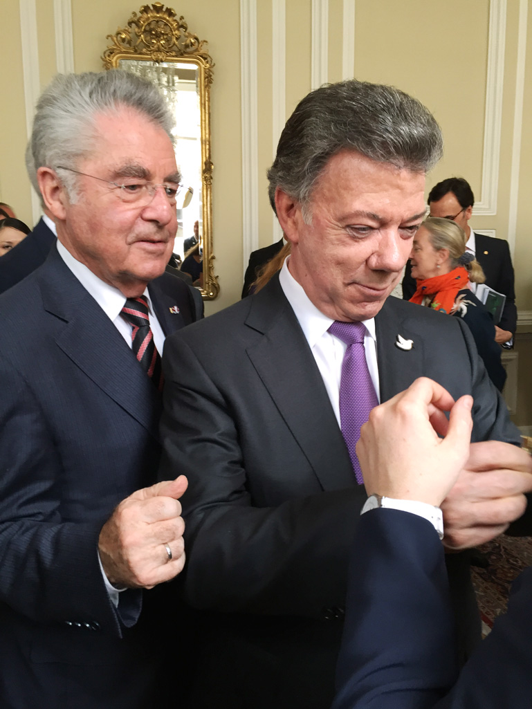 Juan Manuel Santos prezydent Kolumbii w latach 2010–2018, Laureat Pokojowej Nagrody Nobla w 2016, spotkał się w Bogocie z Prezydentem Austrii Heinzem Fischerem (2004–2016). Towarzyszyła mu bardzo ważna, 80-osobowa delegacja, zarówno z sektora publicznego, jak i prywatnego, z sektora edukacyjny, sektora kultury i wielu przedsiębiorców. W rozmowach omawiano różne kwestie, poczynając od powtórzenia wsparcia, jakie Austria udzieliła procesowi pokojowemu do mechanizmów współpracy z Unią Europejską. Wykorzystano doświadczenie Austrii w zakresie działań rolnośrodowiskowych w rolnictwie ekologicznym. Przedstawiono projekt „Biocolombia”, aby ukazać różnorodność biologiczną kraju i wzbudzić zainteresowanie jednostek naukowych jak austriackie uniwersytety i inne ośrodki badawcze. Podpisano liczne porozumienia współpracy i listy intencyjne.